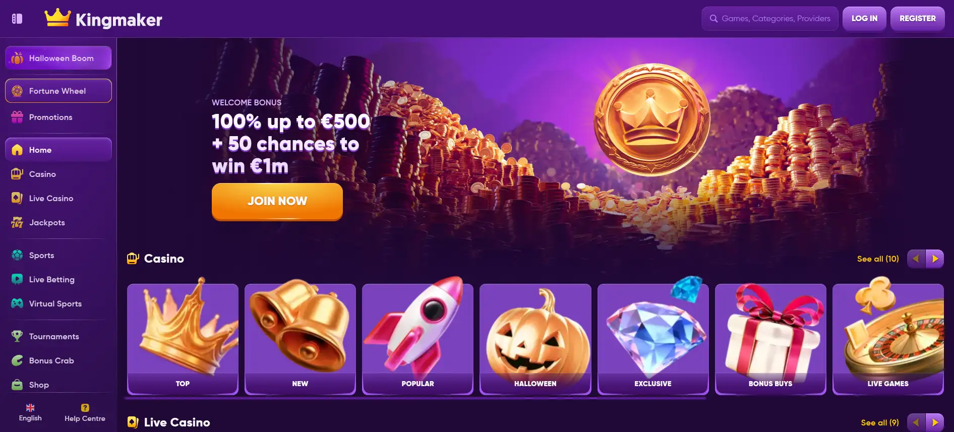 Kingmaker kazino piedāvā plašu azartspēļu un sporta likmju klāstu vienuviet, apvienojot augstas klases izklaidi ar drošu vidi. Šeit atradīsi tūkstošiem spēļu no vadošajiem izstrādātājiem – sākot no populārākajiem spēļu automātiem un galda spēlēm līdz plašam live kazino piedāvājumam ar profesionāliem dīleriem. Kingmaker izceļas ar ātrām izmaksām, personalizētiem bonusiem un īpaši izstrādātu VIP programmu ar naudas atmaksu, lielākiem limitiem un privāto menedžeri. Spēlētājiem pieejamas arī esporta likmes uz tādām spēlēm kā Dota 2 un League of Legends. Vietne ir moderna, lietotājam draudzīga un piemērota gan jauniem spēlētājiem, gan tiem, kas vēlas piedzīvot augstāka līmeņa kazino pieredzi.
