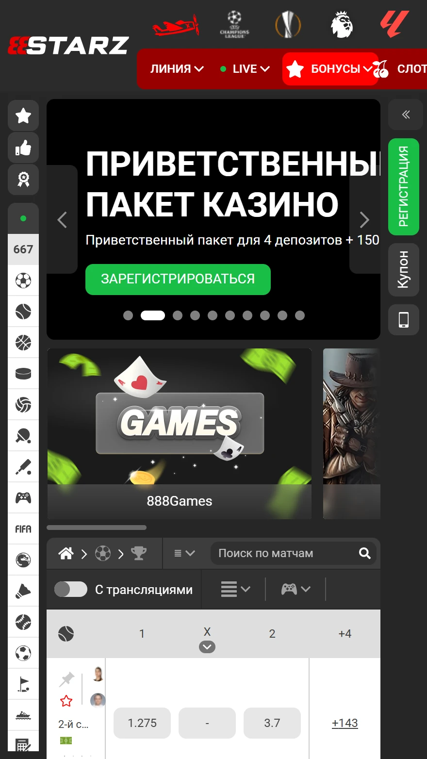 888Starz — это многофункциональная игровая платформа, которая объединяет спортивные ставки, казино и виртуальные турниры в одной современной системе. Она привлекает более 400 000 пользователей по всему миру широким выбором рынков — от футбола и хоккея до киберспорта и ставок на нишевые виды спорта. В ассортименте также более 4000 игровых автоматов, классические настольные игры и джекпоты. Сайт обеспечивает быструю обработку платежей, круглосуточную поддержку клиентов и удобное мобильное приложение. Казино 888Starz выделяется удобным интерфейсом, богатым контентом и высоким уровнем безопасности, что делает его надежным выбором как для любителей спорта, так и для игроков казино в Латвии.